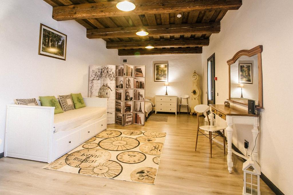 "great room (it is furnished more like a studio), very spacious, excellent location and clean. Fab facilities which made preparing food, getting ready and resting enjoyable. Was nice to have a bath instead of shower and washing machine too. The city's oldest Synagogue (the only one that remained after WWII) is also literally just behind it."